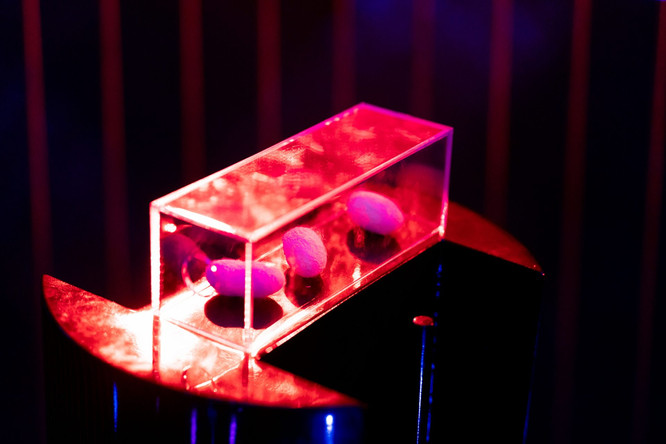 Her work was inspired by traditional East Asia mythology, where a god called 月老 (literally translates to the elder of the moon, the god of love ) would tie the people destined to be together with the red silk of fate (運命の赤い糸), Sputniko works with researchers at the University of Tokyo, they extracted oxytocin. Oxytocin is a special hormone secreted by humans when they fall in love. Sputniko and the researchers then injected the oxytocin along with a coral-red natural die that emits red light to ensemble the Red Silk of Fate into the silkworm's body, making the silkworm spit out the "red thread" carrying human hormones. After she acquired the silk that contains hormones, Sputniko then collaborated with several other embroidery designers to create a shrine-like installation made from the special silk.